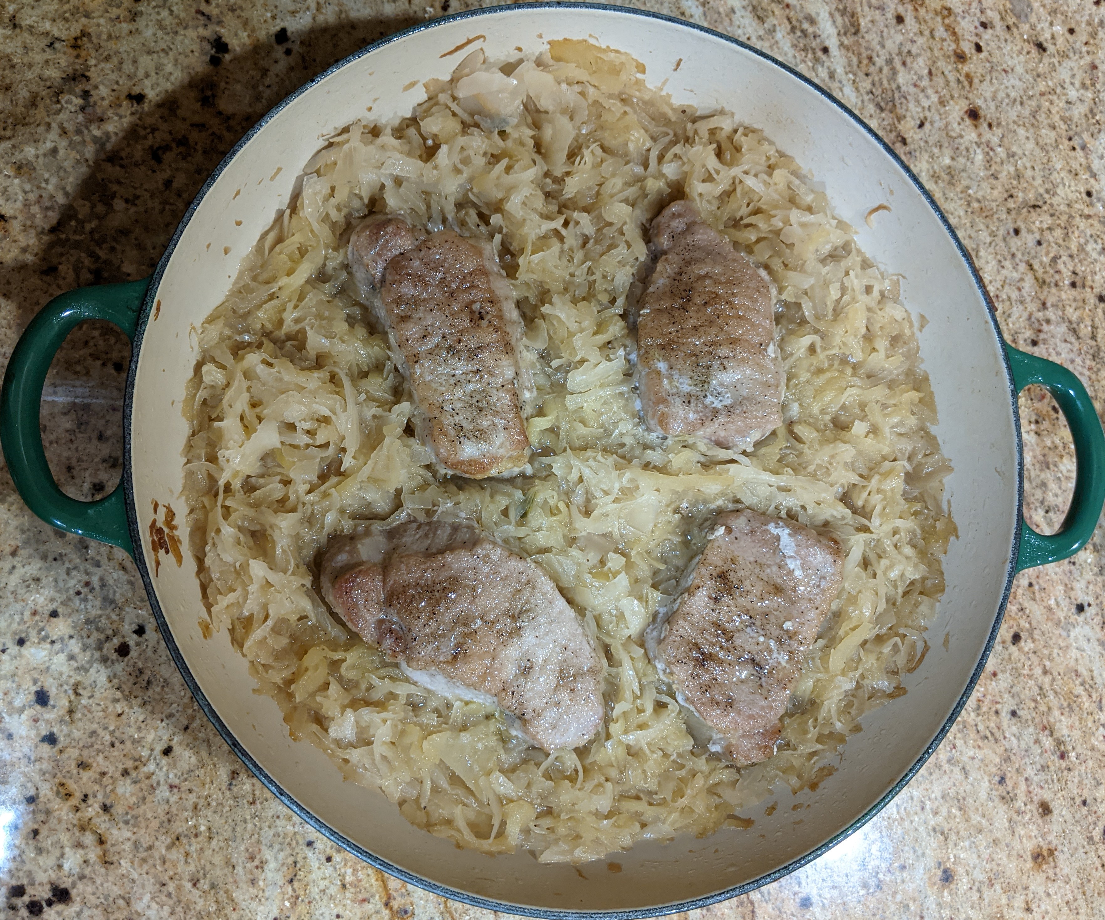 Preheat the oven to 325 degrees. Rinse the pork chops and pat dry with paper towels. Heat a cast iron skillet (or other ovenproof skillet) over medium high heat. Sprinkle salt, pepper and sage on one side of the pork chops. When you can flick a drop of water off your finger tip into the pan and it sizzles and evaporates immediately, the pan is ready. Place the pork chops seasoned side down in the pan. Add salt, pepper and sage to the now ‘up’ side of the meat. Let the meat sear and carmelize in the pan 4-6 minutes per side (turn them only once) depending on the thickness of the chops. You are not cooking them all the way through – just searing the outside. Remove the chops to a plate and reserve. Place the chopped bacon directly in the same pan and cook over medium heat until crispy. Add the onions and the apples and sauté until the onions are soft. Add the sauerkraut. If necessary, add some chicken broth or a bit of water to give the pan some liquid at the bottom (about 1/8th of an inch or so). Add the pork chops back into pan and smother with the sauerkraut mixture. Cover the pan with a piece of foil and place in the oven for 30 minutes to allow the pork chops to tenderize and cook all the way through. Serve immediately or reserve and reheat the next day.