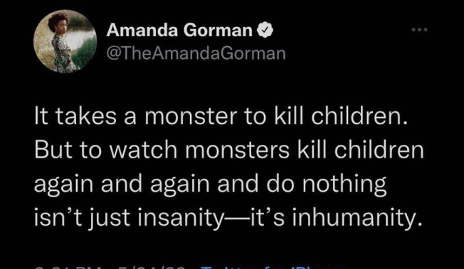 The truth is, one nation under guns May 25, 2022 by Jim at JimsBBS Amanda is our American Poet Share this: Click to share on X (Opens in new window) X Click to share on Facebook (Opens in new window) Facebook Like Loading... Related