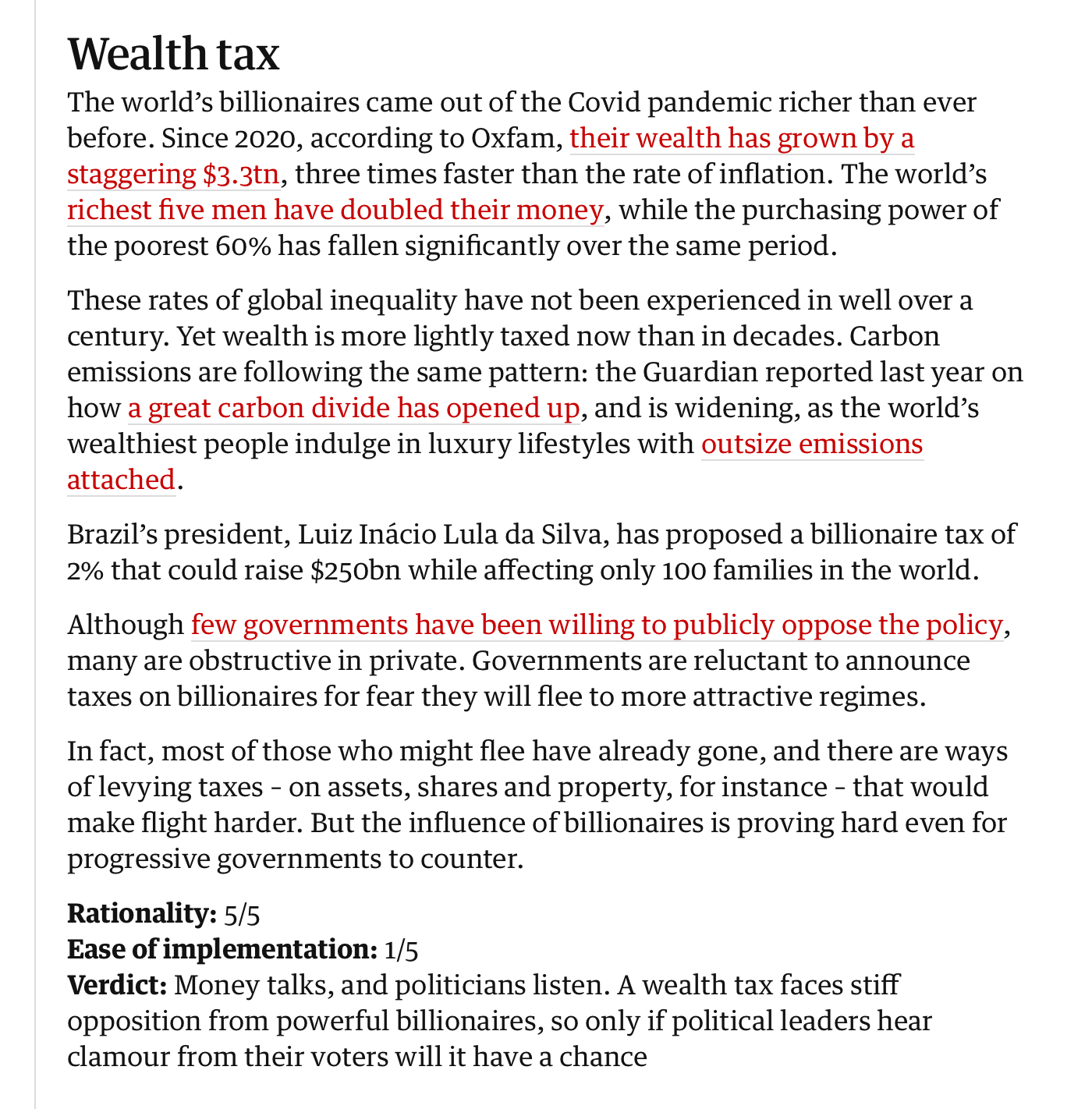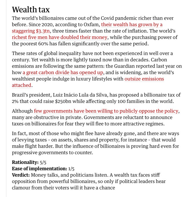 2% Billionaire Tax for Climate Change Would Only Affect 100 Families November 12, 2024 by Jim at JimsBBS This page is from an article in The Guardian Newspaper Nov 12, 2024. It sounds like a great idea! Share this: Click to share on X (Opens in new window) X Click to share on Facebook (Opens in new window) Facebook Like Loading... Related