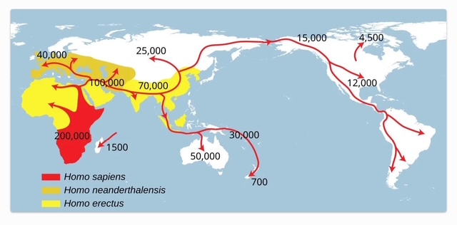 Successive dispersals of Homo erectus, Homo neanderthalensis, and Homo sapiens.