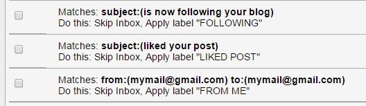 Here are 3 Gmail filters that I really like because they help sort my blog’s control emails into 4 separate folders. #1 is for keeping a list of folks who have decided to Follow my blog. #2 is for people who Liked something on my blog. #3 is for mail that I send to myself for memory sake. #4 is everything else (such as Comments) that will stay in the Inbox.